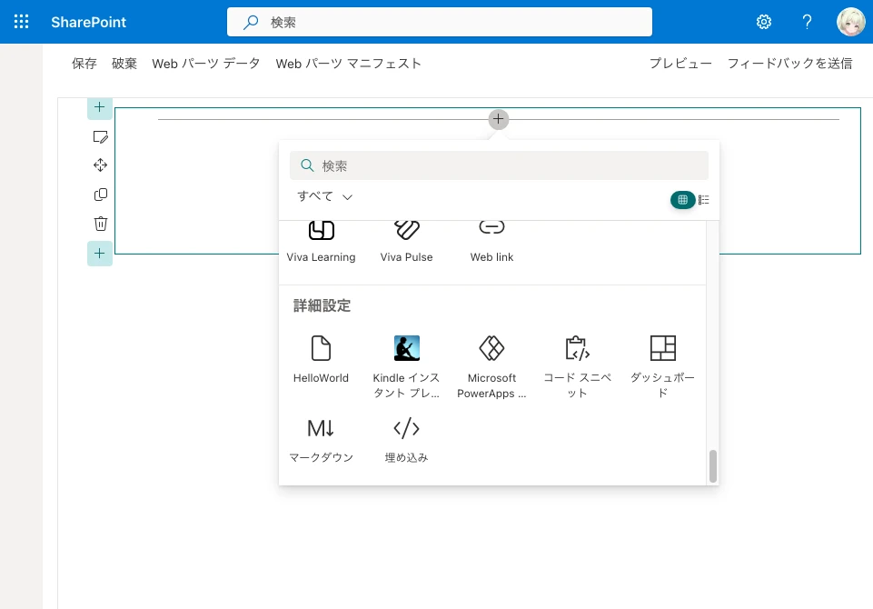 SharePointページの編集画面になっているので、新しいWebパーツの選択から今回作成した「HelloWorld」を探して、ページに追加します。