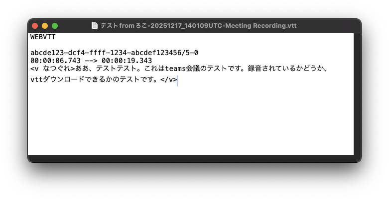 可読性が高く、メモ帳などの一般的なテキストエディタで閲覧可能なほか、ChatGPTやMicrosoft CopilotなどのAIにそのまま会議の会話内容として読ませることもできます。