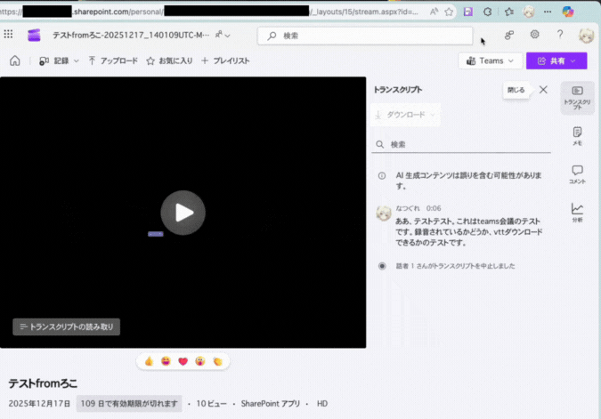 Teams Transcript Downloaderを使うと、会議参加者でもレコーディングの閲覧ページから、文字起こし(トランスクリプト)データをVTT形式でダウンロードすることができます。